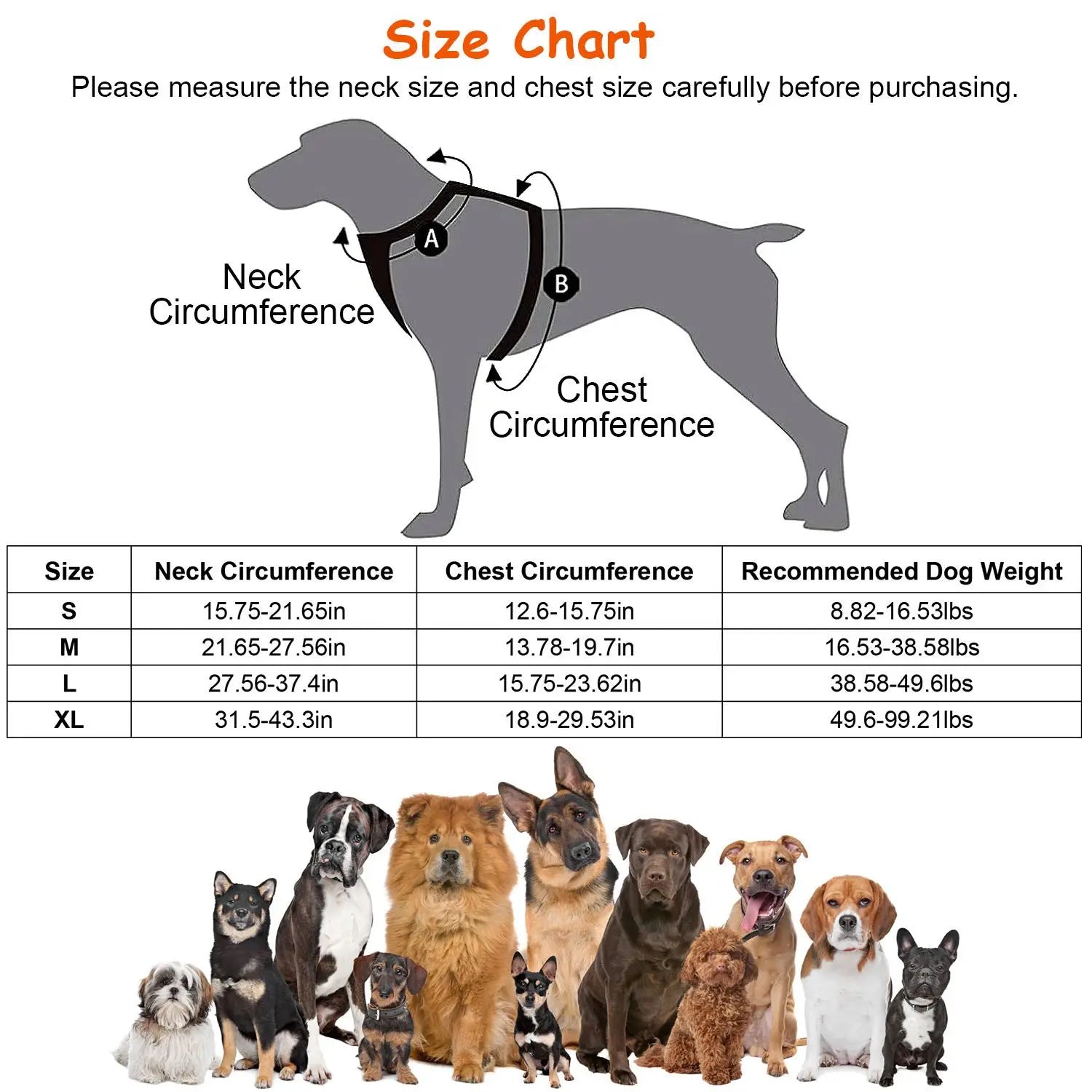 - 4-size range for a secure fit: S–XL harnesses cover dogs from 8.82 to 99.21 lbs; adjust the neck and chest straps with two quick-release buckles to find a choking-free, comfortable fit.