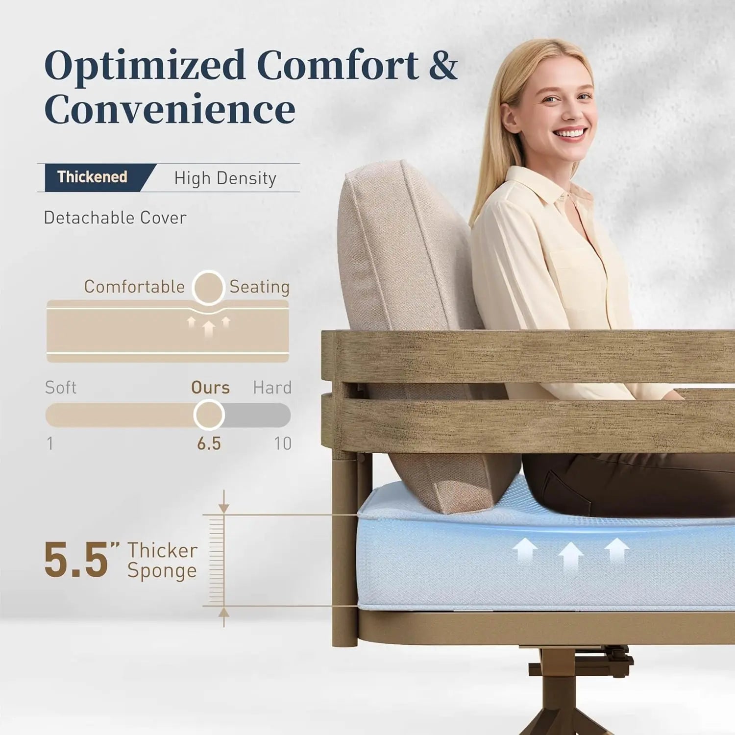 - 5.5-inch cushions with Cushion PRO: 28D density foam for lasting comfort; fabric is waterproof, oil-proof, and stain-resistant for easy wipe-downs.